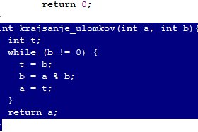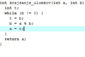 V dokument kopirajte to kodo: int krajsanje_ulomkov(int a, int b) { int t; while (b != 0) { t = b; b = a % b; a = t; } return a; } |