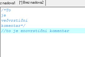 Kot vidite, sem poleg vsake vrstice programa napisal še komentarje, ki so vam lahko v pomoč. Komentarje zapisujemo med "/*" in "*/, lahko pa jih napišemo tudi za znakoma "//" (glej sliko). Uporabljate jih lahko kadar želite in ne vplivajo na sam program.