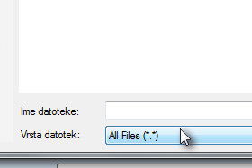 Odpre se okno z raziskovalcem, kjer prvo vrsto datotek preko izbirnika določite All Files (glej sliko).