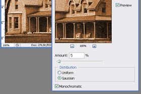 Nastavite Amount 5%, spodaj izberite Distribution Gaussian in pustite izbrano Monochromatic. Še klik na gumb OK. |
