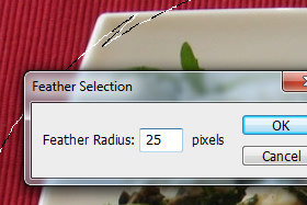 V novem oknu Feather Radius nastavite 25 pixels in kliknite na gumb OK. S tem ukazom smo pogladili rob med selekcijo. |