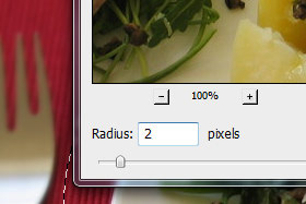 S tem ukazom smo selekcijo obrnili. Kar je bilo prej označeno, sedaj ni več. Potem pa kliknite zgoraj na Filter, Blur in izberite Gaussian Blur... V novem oknu Radius nastavite na 2 pixels in kliknite na gumb OK. |