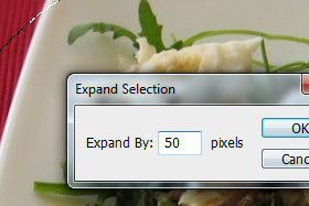 S tem ukazom smo selekcijo ponovno obrnili. Kliknite zgoraj na Select, Modify in izberite Expand... V novem oknu Expand By nastavite 50 pixels in kliknite na gumb OK. |