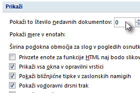 Poiščite polje Prikaži in nato Pokaži to število nedavnih dokumentov na 0.