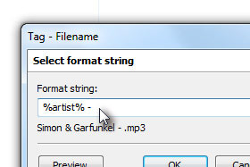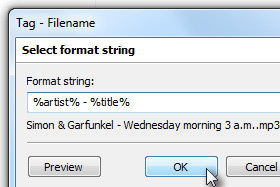 Sedaj smo določili, da bo vse datoteke preimenoval na podlagi značk tačko, da bo prvo napisal izvajalca in nato za pomišljajem naslov skladbe.