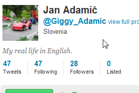 Aktivirali ste Twitter. Sedaj lahko prvič poiščete prijatelje na Twitterju in sledite njihovim objavam s tipko Follow (glej sliko).