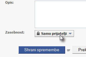 Pri polju Zasebnost določite Samo prijatelji in kliknite na gumb Shrani spremembe. Če bi radi album delili tudi z prijatelji vaših prijateljev, potem izberite Samo prijatelji prijateljev. |