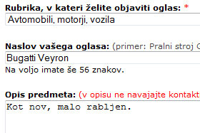 Spodaj določite še rubriko, naslov in opis predmeta v polje Naslov vašega oglasa.