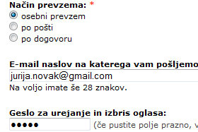 Določite še način prevzema, vaš elektronski naslov in geslo, da boste oglas lahko kasneje urejali. |