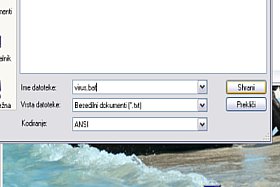 Tam, kjer shranjujemo, tako v polje Ime Datoteke vpišemo virus.bat, v kolikor pa ste v notepad napisali kaj drugega, kot npr. cinema.bat, pa shranimo kot cinema.bat.