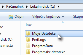 Odpremo Raziskovalce ter se postavimo na Lokalni disk (C) ter tam ustvarimo novo mapo z imenom Moje_Datoteke.