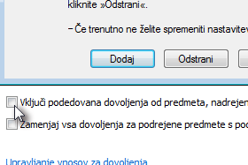 ![]() V našem primeru bomo sedaj izklopili dedovanje pravic od višje ležeče mape. S tem bomo pridobili poln nadzor nad nastavljanjem pravic nad mapo. |