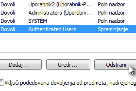 ![]() Podobno sedaj odstranimo skupino Authenticated users, ki predstavlja vse uporabnike, ki so prijavljeni v sistem. |