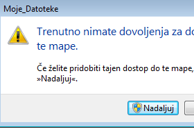 ![]() V kolikor bo sedaj do te mape dostopal nekdo z drugim uporabniškim računom kot Uporabnik2 in ki ne pripada skupini Administratorjev, bo dobil obvestilo, da nima dovoljenja za dostop do te mape. |