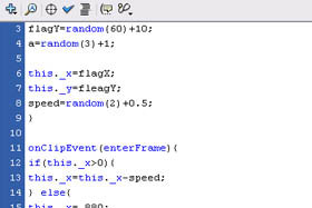 onClipEvent(load){ flagX=random(800)+50; flagY=random(60)+10; a=random(3)+1; this._x=flagX; this._y=flagY; speed=random(2)+0.5; } onClipEvent(enterFrame){ if(this._x>0){ this._x=this._x-speed; } else{ this._x= 880; } } |