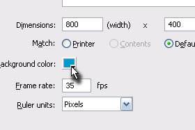 V polje Dimensions vpišite 800 x 400. Background color določite svetlo modro barvo. Frame rate nastavite 35 fps. Potrdite spremembe na gumb OK. |