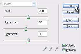 Prvo označite Colorize. Jaz sem potem določite Hue 200, Saturation 50 in Lightness 10. Tukaj vam priporočam, da si poljubno nastavljate barve. kliknite na gumb OK, ko boste končali. |