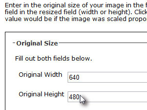 ![]() Kliknite tukaj, da odprete spletno stran, ki vam bo izračunala prave proporcionalne dimenzije, s katerimi boste pravilno prilagodili sliko. Ne skrbite, odprlo se vam bo novo okno. Nato pa v polje Original Width vpišite vrednost width, ki ste jo spoznali v prejšnjem koraku in prav tako vrednost height v polje Original Height. V mojem primeru je bila širina slike 640 in višina 480 slikovnih pik. |
