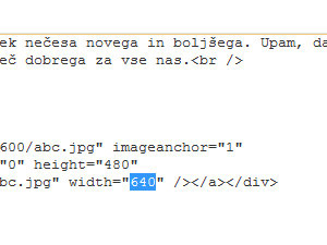 ![]() Nato pa znotraj HTML kode poiščite kodo, ki prikazuje sliko v vašem članku in poiščite ter si zapomnite vrednosti width in height (glej sliko). Če boste tukaj imeli težave, vam bomo rade volje pomagali na forumu.