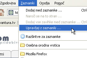 Kliknite na Zaznamki in izberite Upravljaj z zaznamki ...