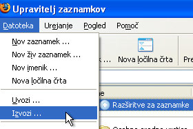 Kliknite na Datoteka in izberite Izvozi ... Tukaj boste tudi lahko uvozili zaznamke. Izberite opcijo Uvozi ... in določite datoteko, ki jo boste v tej lekciji ustvarili. |
