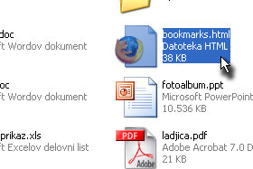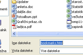 V mojem primeru je to bookmarks.html, k ise nahaja v mapi Moji dokumenti. Priporočam vam, da si to datoteko pošljete na kak spletni poštni nabiralnik (gmail, hotmail...) in si jo tako dodatno shranite. |