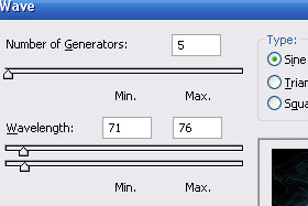 Type določite Sine. Number of Generators določite 5. Wavelenght nastavite 71 in 76 (glej sliko). Ne zaprite še okna... |