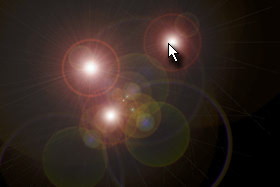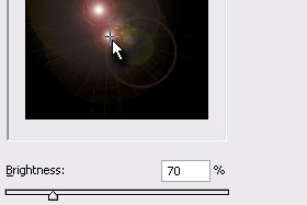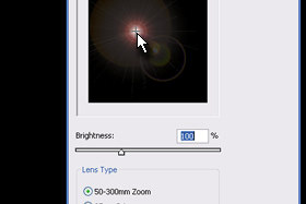 Brightness pustite nastavljeno 100 %, Lens Type pa 50-300mm Zoom. Efekt naj bo postavljen nekje na sredini (glej sliko). Z miško klikajte po sliki, da določate pozicijo efekta. Potrdite spremembe na gumb OK. |