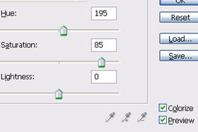 Prvo označite Colorize. Hue nastavite 195, Saturation 85 in Lightness 0. Potrdite spremembe na gumb OK. |