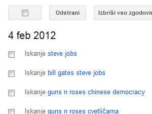 Naslov je www.google.com/history/. Po vsej verjetnosti imate zgodovino iskanja vklopljeno. Prav zanimivo je pogledati, kaj vse ste iskali včasih. Vzemite si čas, pa poglejte malo. |
