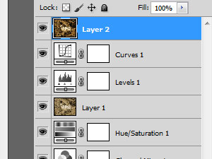 Sedaj pa bi radi sliko, ki jo vidimo na dokumentu prilepili kot nov layer (vključujoč z nastavitvenimi layerji oziroma plastmi). Pritisnite tipki Ctrl + A, da označite dokument. Potem pritisnite tipki Ctrl + Shift + C, da kopirate sliko. Pritisnite tipki Ctrl + V, da prilepite kopirano sliko v nov layer. V primeru normalnega kopiranja, bi vam Photoshop kopiral le nastavitveni layer in ne bi bilo efekta. |