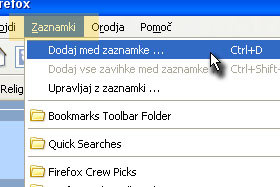 Kliknemo zgoraj na Zaznamki in izberemo Dodaj med zaznamke ... (lahko pa tudi pritisnemo tipke CTRL in D skupaj).