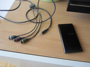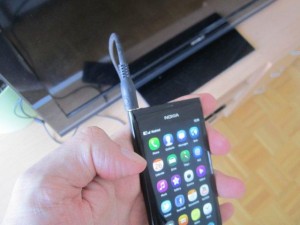 Drugi del kabla pa vtaknite v prostor za slušalke na Nokia N9.