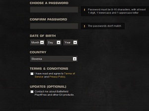 Vpišemo elektronski naslov in kliknemo NEXT. Napišemo še željeno geslo, rojstne podatke, svojo državo ter označimo, da se strinjamo s pogoji. Če želite, lahko prejemate tudi e-pošto o novostih.