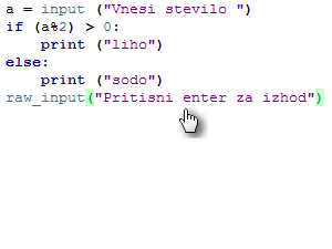 a = input ("Vnesi stevilo ") if (a%2) > 0: print ("liho") else: print ("sodo") raw_input("Pritisni enter za izhod") Zgornja koda nas najprej vpraša za število. Druga vrstica nam preveri če je število liho ali sodo. V 3., 4., 5. pa nam program izpiše ali je to število sodo ali liho. |