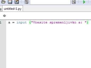 a = input ("Vnesite spremenljivko a: ") Zgornja koda bo uporabnika vprašala za vrednost spremenljivke a. Ko jo bo uporabnik vtipkal se bo le ta shranila pod spremenljivko a. |