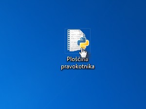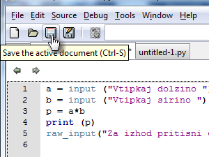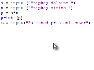 Tega se najprej lotimo tako, da se vprašamo, kakšna je formula za izračun ploščine pravokotnika. Ker je ploščina le-tega (p = a*b) mora program vprašati za obe spremenljivki. Zato vpišemo: a = input ("Dolzina stranice a: ") b= input ("Dolzina stranice b: ") Sedaj pa mora program te dve stranici pomnožiti zato vpišemo: p = a*b Ker želimo, da porgram vrednost ploščine tudi izpiše mu ukažemo: print (p) Ker bom jaz potem ta programček shranil mu bom še vpisal kodo, ki bo omogočila, da se program ne bo kar sam zaprl (zaprli ga bomo lahko z tipko enter): raw_input("Za izhod pritisni enter") |