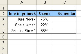 ![]() Kliknite na celico, kjer bomo izračunali oziroma izvedeli komentar za prvega učenca (glej sliko). |