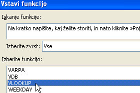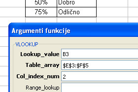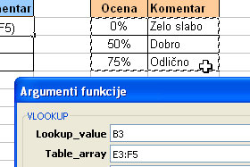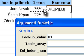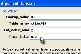 ![]() Kliknite v polje Table_array in potem z miško označite vse celice v tabeli na desni strani (glej sliko). |