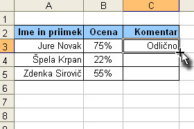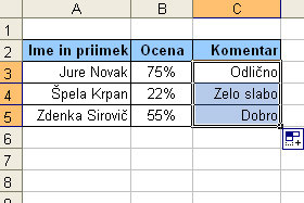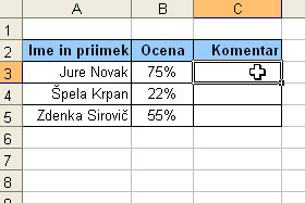 ![]() Kliknite dvakrat z miško na črn plus znak in kometarji se bodo avtomatsko kopirali še v ostale celice.