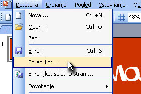 Ker pa moj prijatelj ne uporablja pisave, ki sem jo jaz uporabil v diaprojekciji moram v datoteko shraniti tudi pisavo, ki sem jo uporabil.