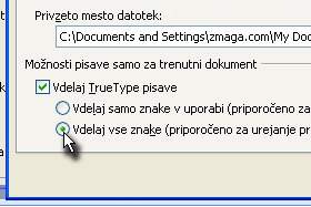 Spodaj v oknu označite Vdelaj TrueType pisave. Potem pa označite Vdelaj vse znake (priporočeno za urejanje pri drugih). Kliknite na gumb V redu. |