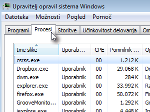 ![]() V kolonah dobimo prikazane različne podatke o posameznih procesih, ki se izvajajo. |