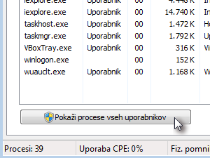 ![]() Ker pa želimo videti čisto vse procese, ki se trenutno izvajajo na računalniku, kliknemo še gumb Pokaži procese vseh uporabnikov. |