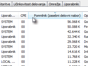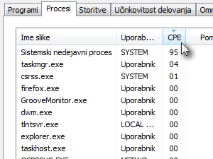 ![]() Druga zelo uporabna kolona pa je CPE, ki prikazuje, koliko procesorskega časa trenutno zaseda posamezni proces. |