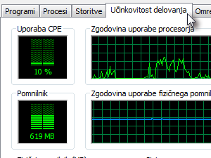 ![]() Če sedaj kliknete še zavihek Učinkovitost delovanja, pa boste na grafu lahko razbrali, kako se je poraba procesorskega časa in pomnilnika gibala čez določeno časovno obdobje. |