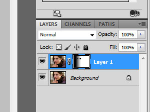 Z prelivom in čopičem ste s pomočjo maske odkrivali spodnji layer. Predstavljajte si, da vzamete list belega papirja in ga postavite čez obraz, potem pa s črno barvo ustvarjate luknje in tako vidite skozi.