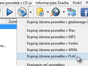 Kliknite sedaj na puščico navzdol pri ikoni za zapisovanje (glej sliko) in izberite Kopiraj izbrane posnetke v FLAC.