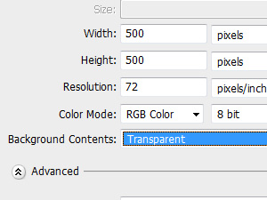 Ustvarite nov dokument s širino in dolžino 500 pik ter nastavite ozadje transparentno.